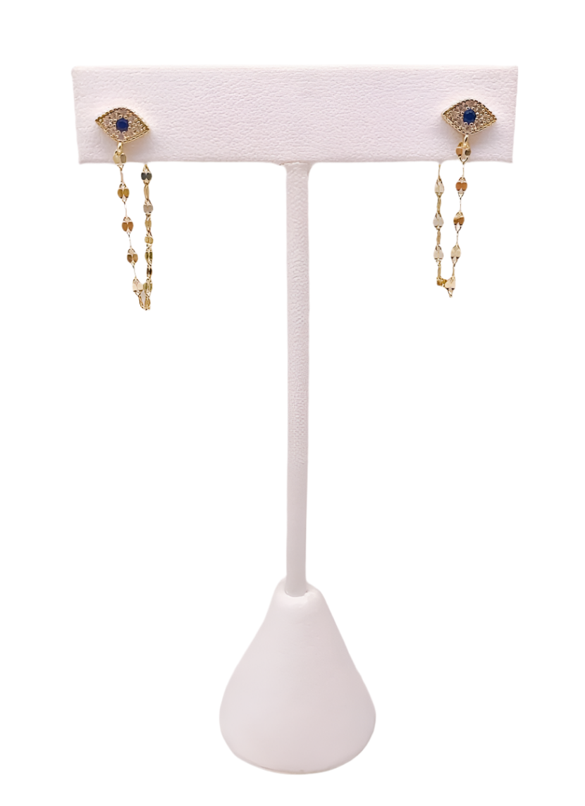 Introducing Chained Vision Studz, the perfect blend of elegance and edginess. These gold filled evil eye studs are adorned with an eclectic chain, adding a unique touch to your look. Protect yourself from negativity and stay stylish with Chained Vision Studz.