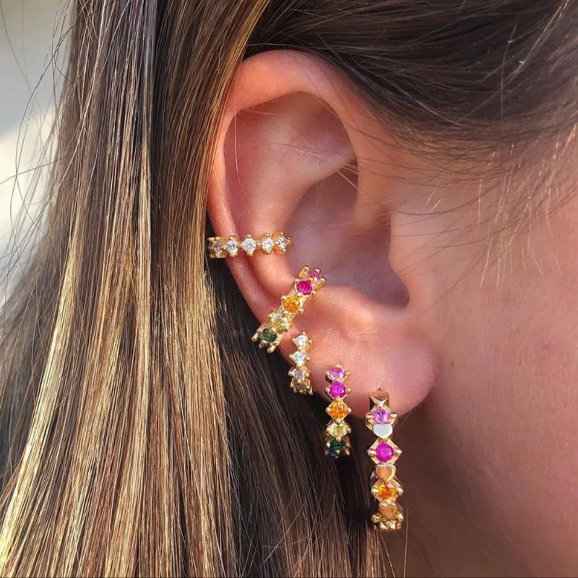 Add a burst of color to your everyday look with our Rainbow Mini Studz + Ear Cuff! Made with hypo-allergenic materials, these mini studz come in gold or silver plating. Plus, every order of gold mini hoops includes a bonus rainbow studded ear cuff.