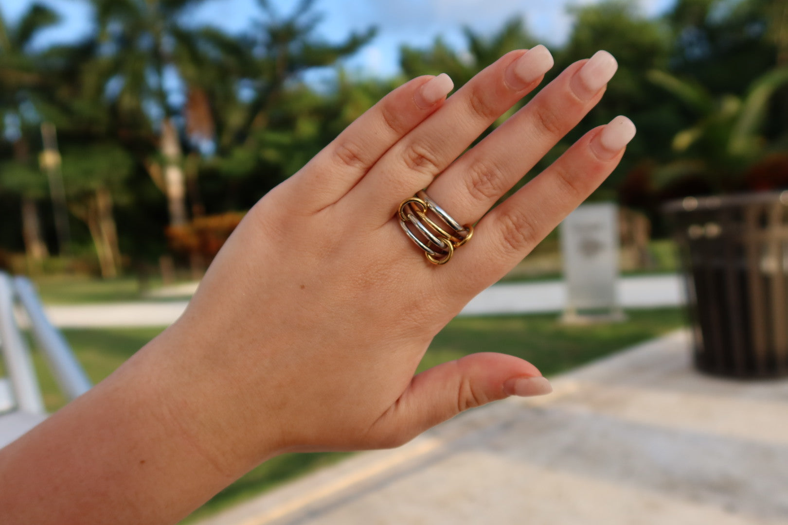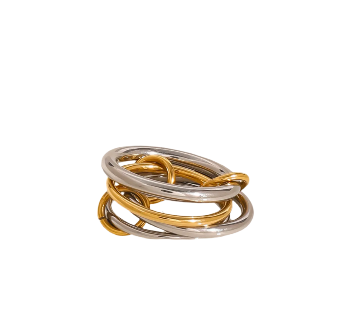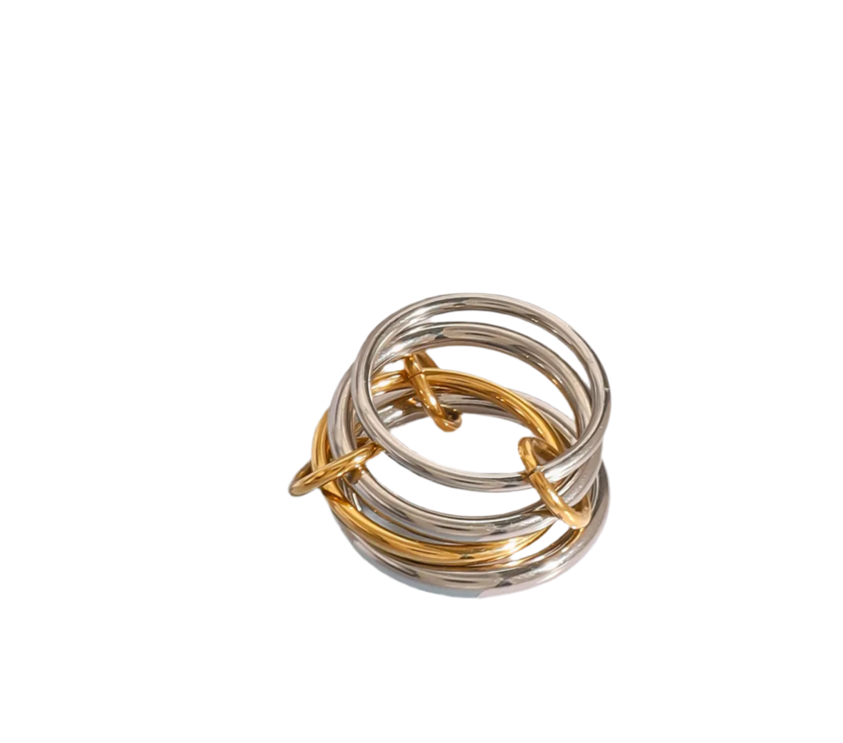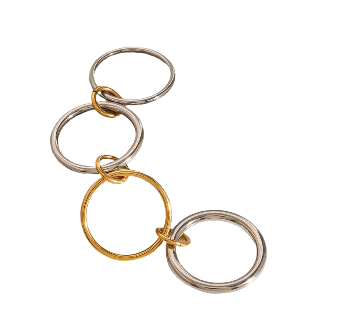 Expertly crafted, the Rivington Street ring features four rings - three silver and one gold - connected by gold connectors. Made of hypoallergenic, waterproof stainless steel, this chic and durable accessory adds a touch of sophistication to any outfit.